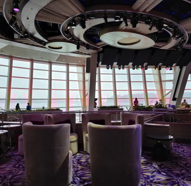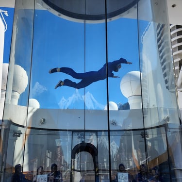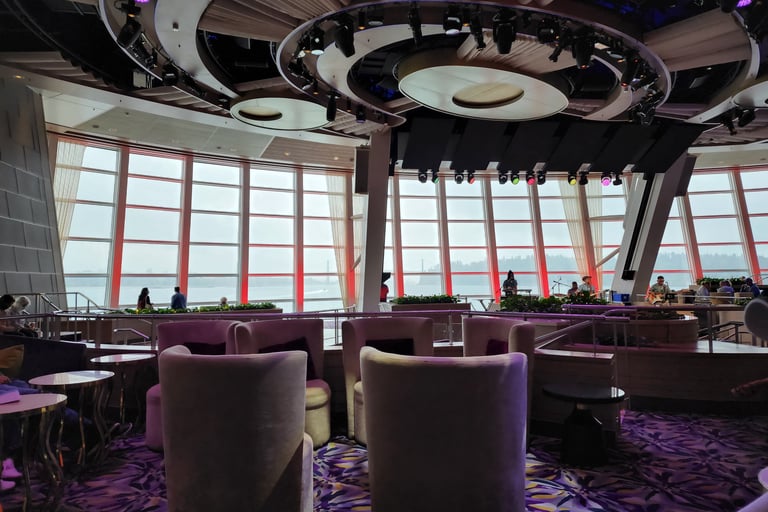 If you're a thrill-seeker, you have to check out RipCord by iFLY. It's a skydiving simulator right on the ship. You get to feel what it's like to freefall without the whole "jumping out of a plane" part. My husband Kirk did it and absolutely loved it. He was a natural and couldn't stop grinning the whole time. The best part is, they have times available where it’s free of charge, so you can just walk up and give it a try. And for anyone who's ever wanted to surf, they've got the FlowRider, a surf simulator where you can try to catch a wave. My favorite spot might be Two70. During the day, it's just a lounge with these huge windows that give you an incredible 270-degree view of the sea. But at night, the whole room transforms. The windows get covered by a giant screen, and these robotic screens called "Roboscreens" move around. The shows they put on, like Spectra's Cabaret, are just mind-blowing. It’s like a live show and a movie all in one.